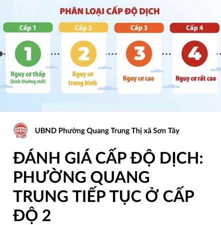 Riêng tại thị xã Sơn Tây có 5 phường ở cấp độ dịch 2 (mức độ lây nhiễm mức độ 3) gồm: Quang Trung, Ngô Quyền, Sơn Lộc, Trung Hưng và Trung Sơn Trầm. Các phường đã có thông báo đến người dân về việc áp dụng các biện pháp hành chính tương ứng cấp độ 2 để phòng, chống dịch COVID-19 trên địa bàn với một số nội dung trọng tâm như: đối với người tham gia tập luyện thể dục thể thao ngoài trời phải đáp ứng điều kiện tiêm đủ liều vắc xin hoặc đã khỏi bệnh COVID-19; thực hiện nghiêm thông điệp 5K: “KHẨU TRANG- KHỬ KHUẨN- KHOẢNG CÁCH- KHÔNG TỤ TẬP- KHAI BÁO Y TẾ”. Đối với tổ chức lễ cưới: Số lượng người tham dự lễ cưới không tập trung quá 30 người/thời điểm. Những người thuộc diện cách ly hoặc theo dõi sức khoẻ hoặc có triệu chứng nghi ngờ mắc COVID-19 không tham dự. Yêu cầu 100% người tham dự đã được tiêm đủ liều vắc xin hoặc đã khỏi bệnh COVID-19, có kết quả xét nghiệm âm tính với SARS-CoV-2 trong vòng 72 giờ. Phải tuân thủ 5K trong quá trình tham dự; luôn giữ khoảng cách giữa các bàn, không tiếp xúc gần với nhau; gia đình không thực hiện chúc mừng tại từng bàn; Rút ngắn tối đa thời gian tổ chức lễ cưới; Địa điểm tổ chức lễ cưới đảm bảo thông thoáng, tăng cường thông khí, hạn chế sử dụng điều hoà; Ký cam kết tuân thủ quy định phòng chống dịch của Bộ Y tế và chịu sự giám sát của UBND phường.