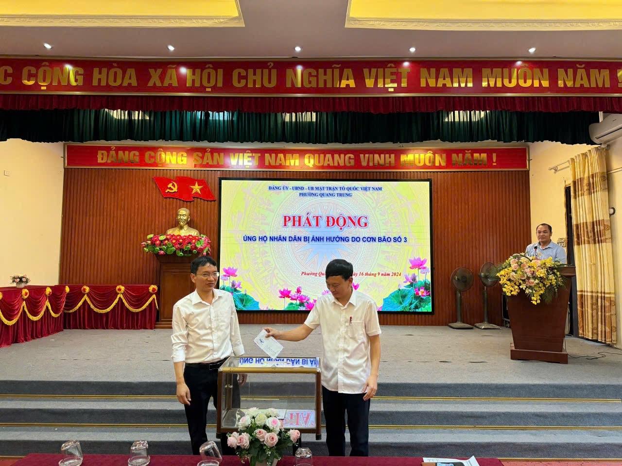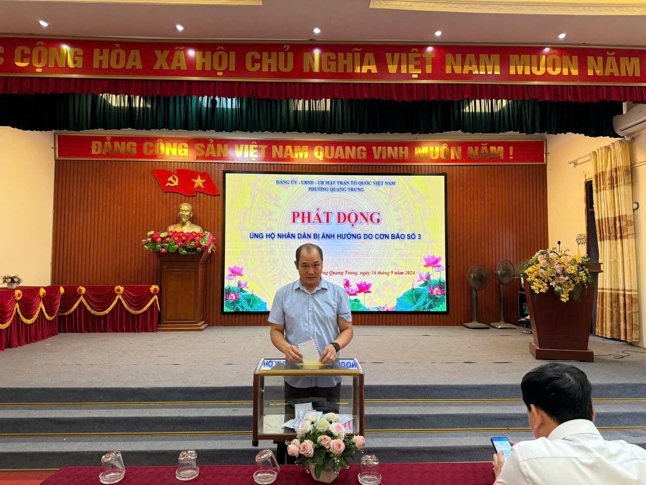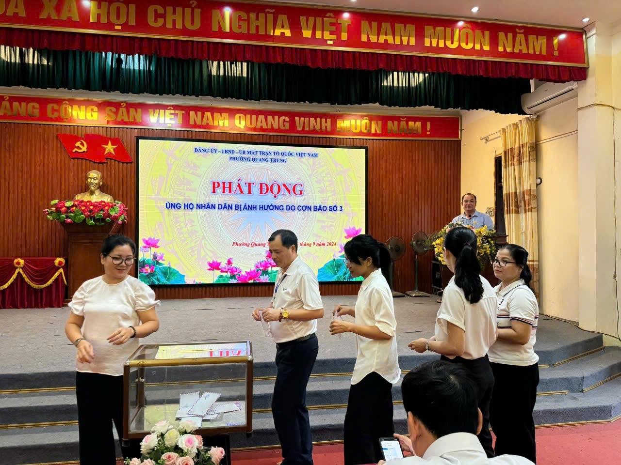 Hưởng ứng lời kêu gọi của Uỷ ban MTTQ Việt Nam thành phố Hà Nội " Nhân dân Thủ Đô tham gia ủng hộ các tỉnh bị thiệt hại do bão lũ", sáng ngày 16/9/2024, sau giờ chào cờ sáng thứ Hai đầu tuần, Đảng ủy – UBND - Ủy ban MTTQ phường Quang Trung tổ chức phát động ủng hộ đồng bào bị thiệt hại do bão số 3.