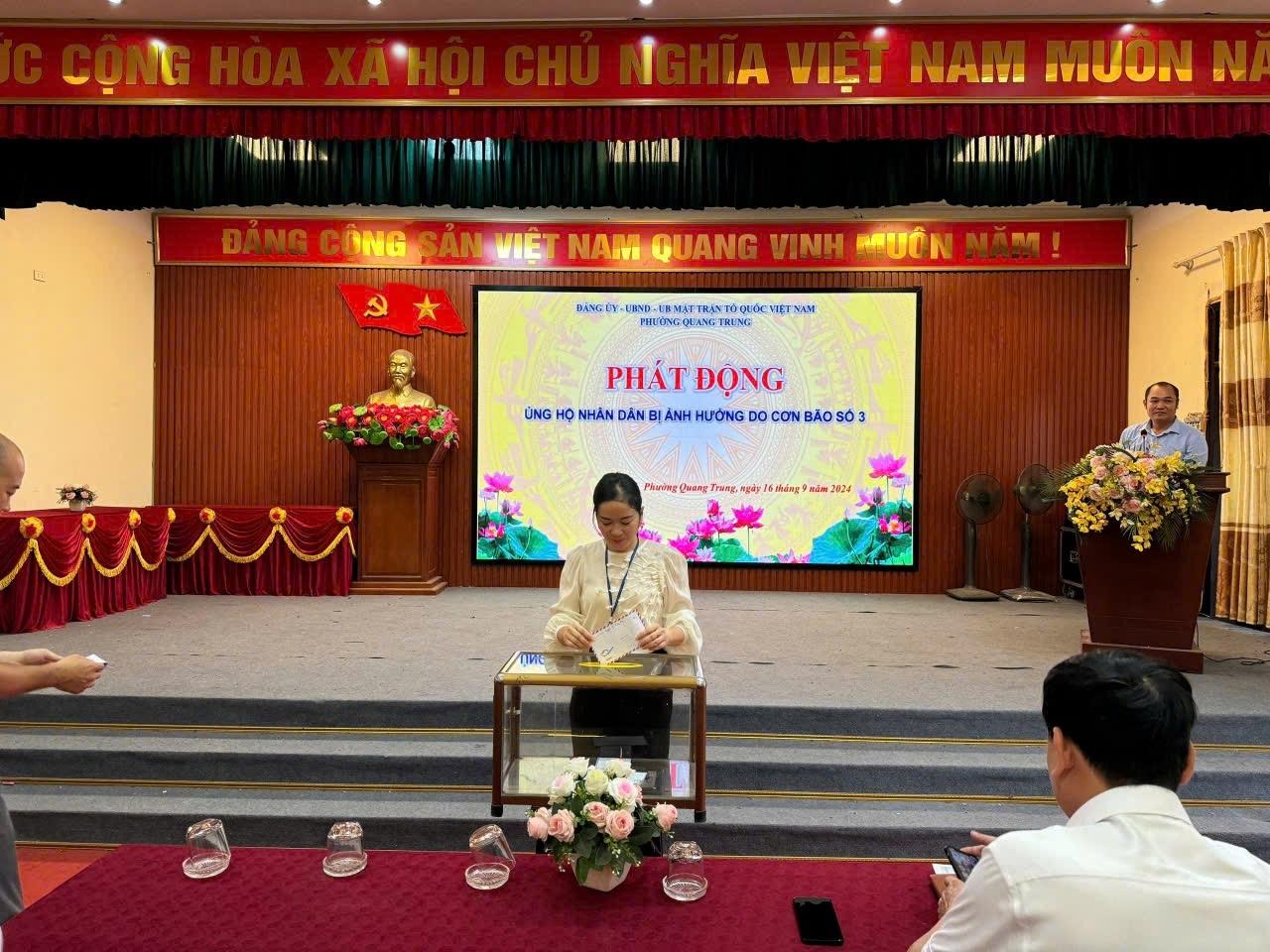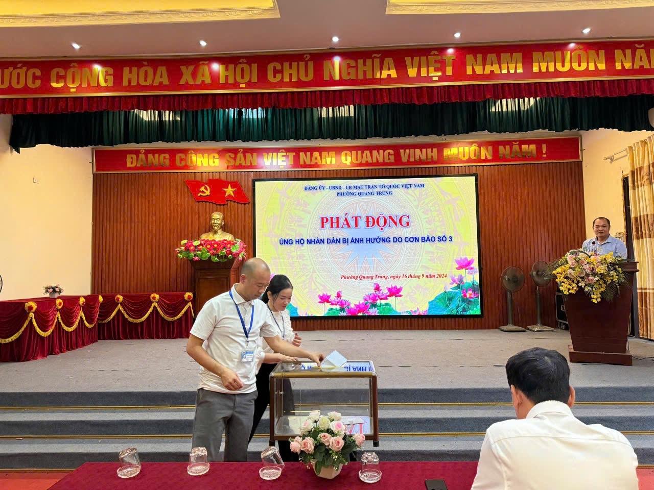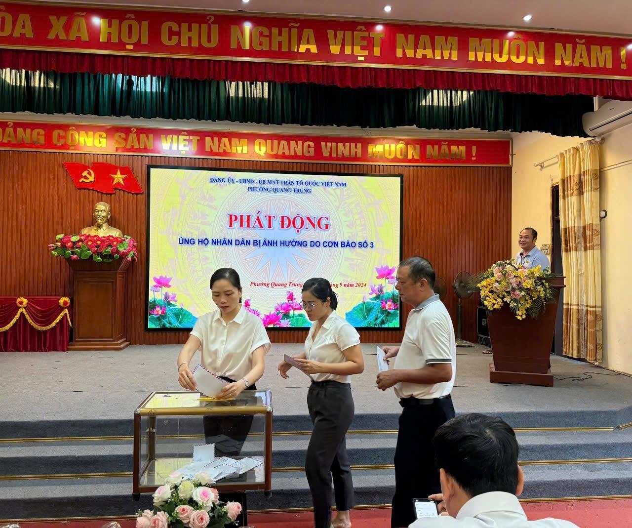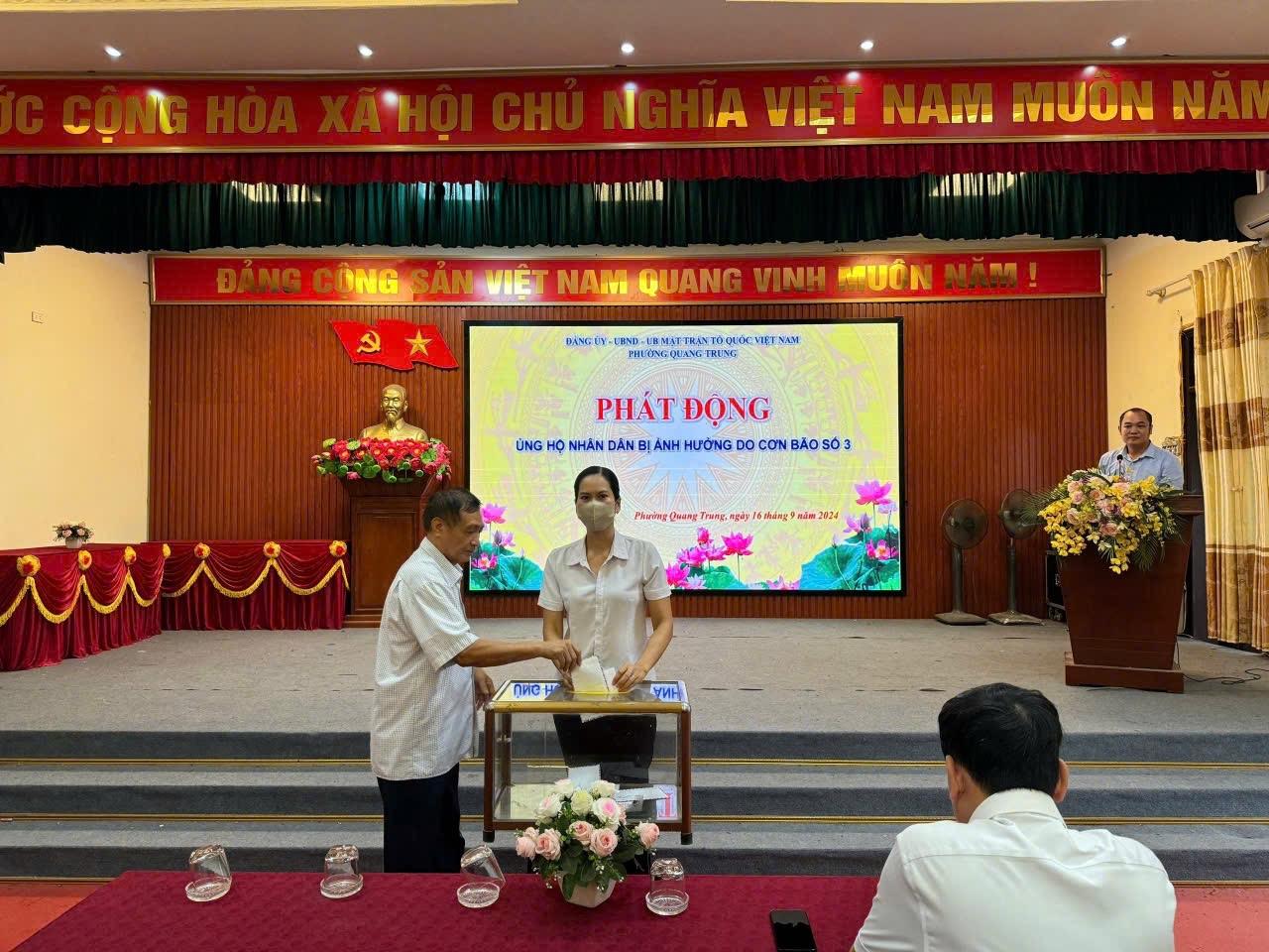 Hưởng ứng lời kêu gọi của Uỷ ban MTTQ Việt Nam thành phố Hà Nội " Nhân dân Thủ Đô tham gia ủng hộ các tỉnh bị thiệt hại do bão lũ", sáng ngày 16/9/2024, sau giờ chào cờ sáng thứ Hai đầu tuần, Đảng ủy – UBND - Ủy ban MTTQ phường Quang Trung tổ chức phát động ủng hộ đồng bào bị thiệt hại do bão số 3.