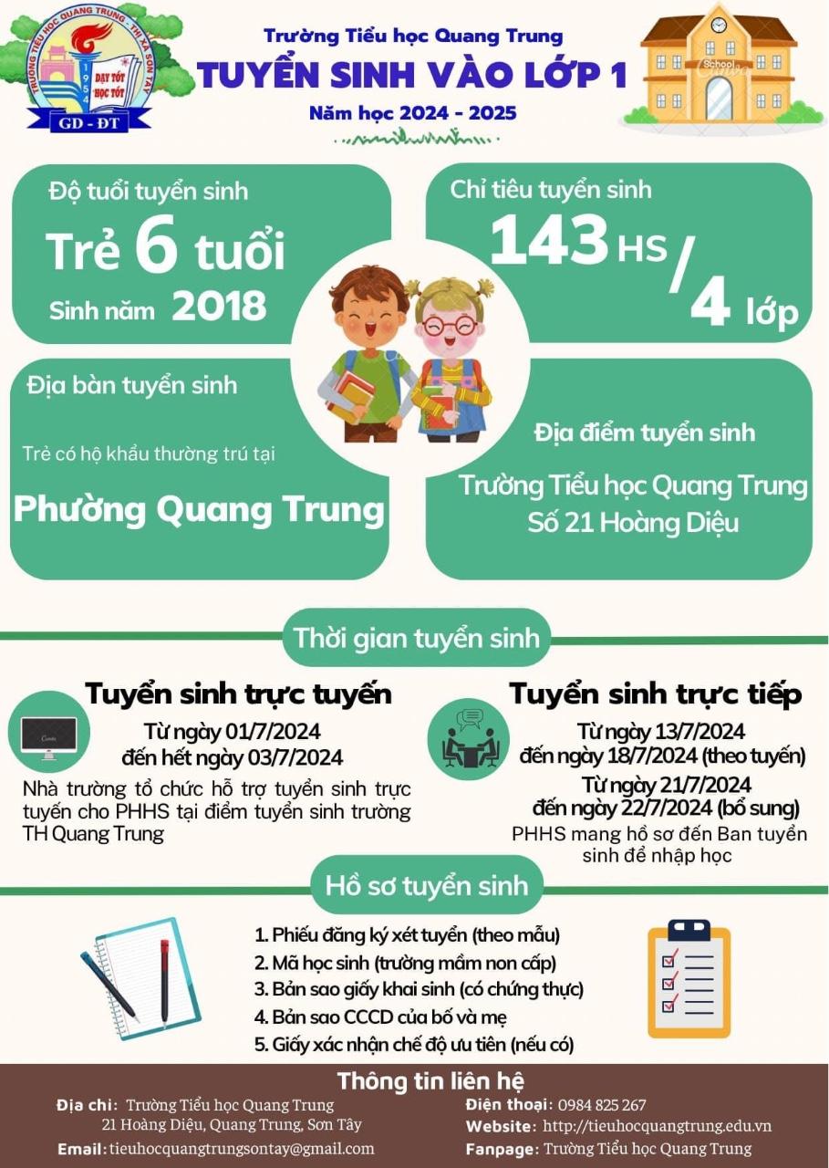 THÔNG BÁO TUYỂN SINH LỚP 1 TRƯỜNG TIỂU HỌC QUANG TRUNG NĂM HỌC 2024-2025 12/06/2024 Xem chi tiết dưới đây: Nhập mô tả ảnh tại đây