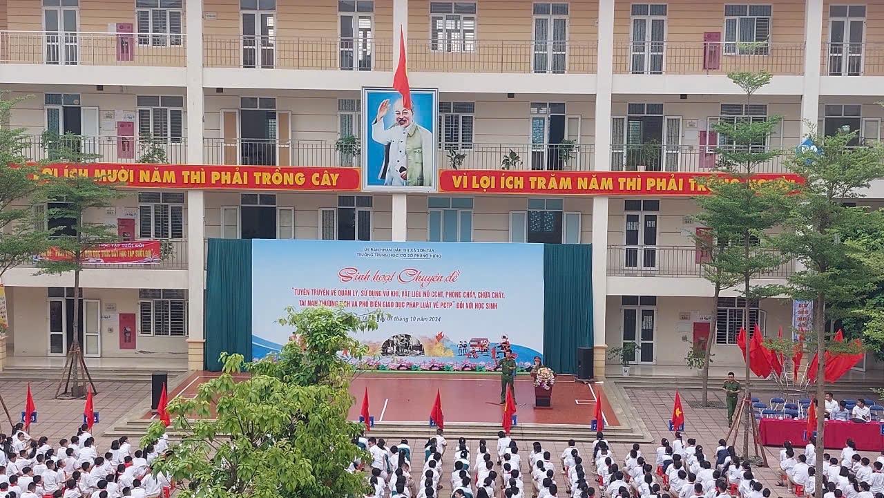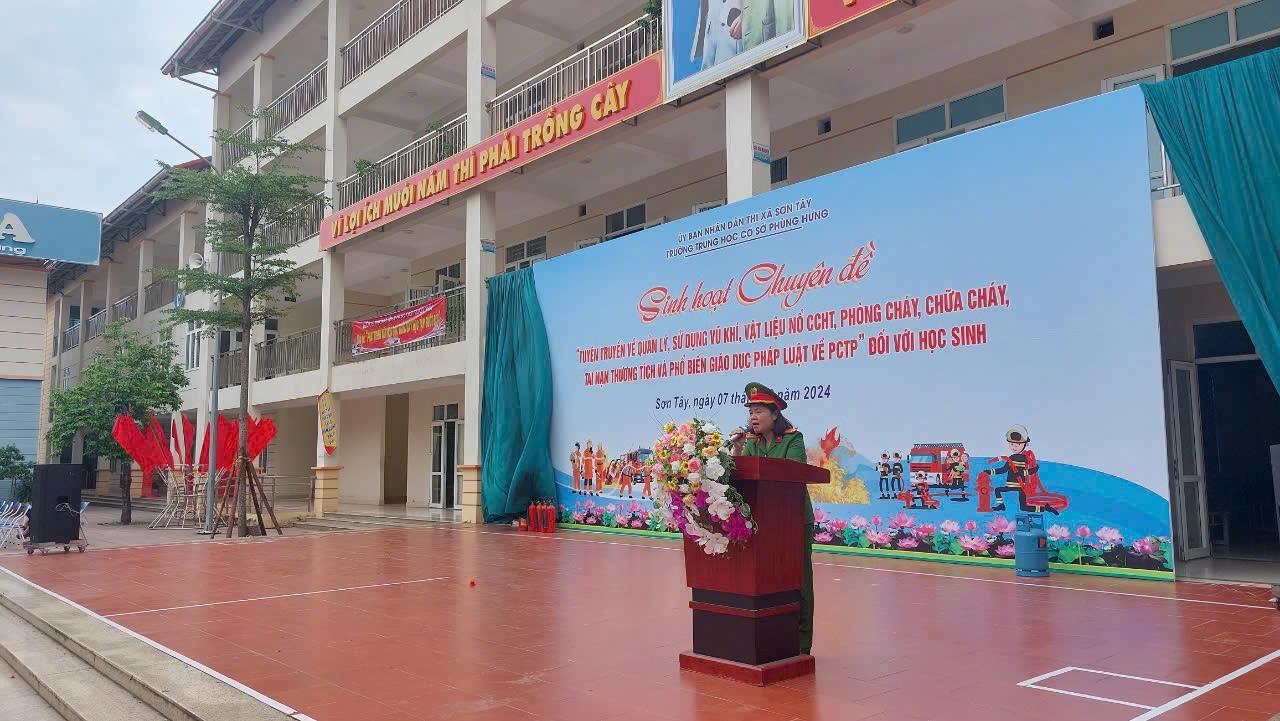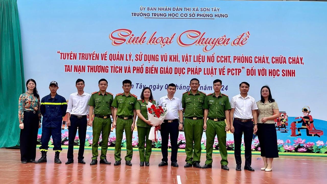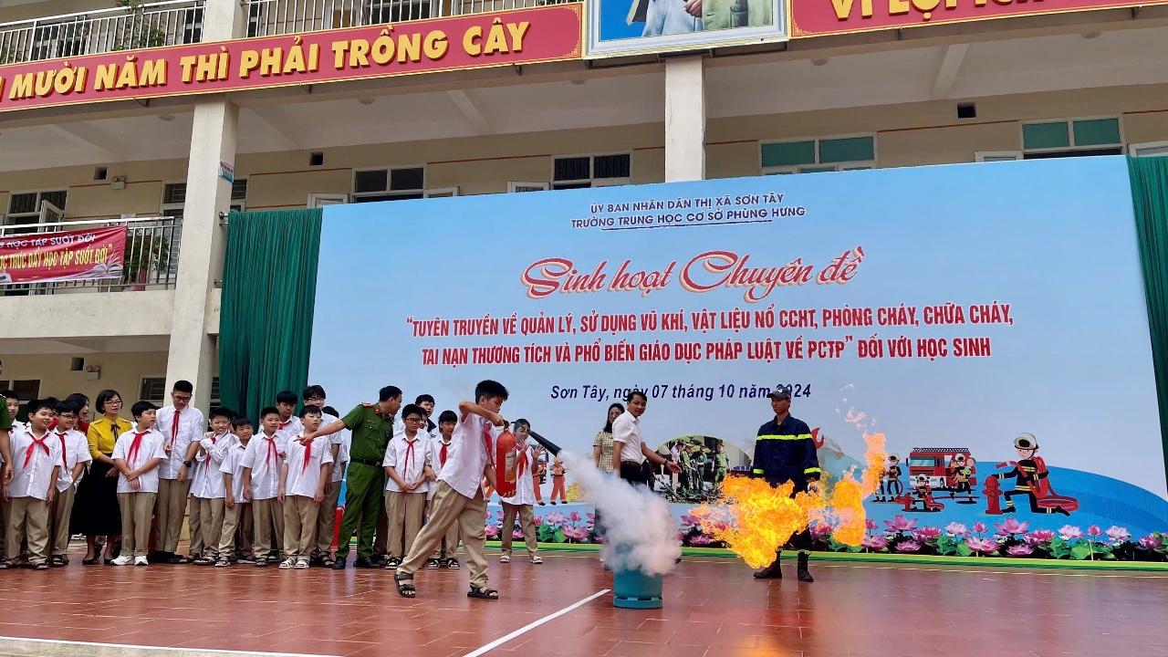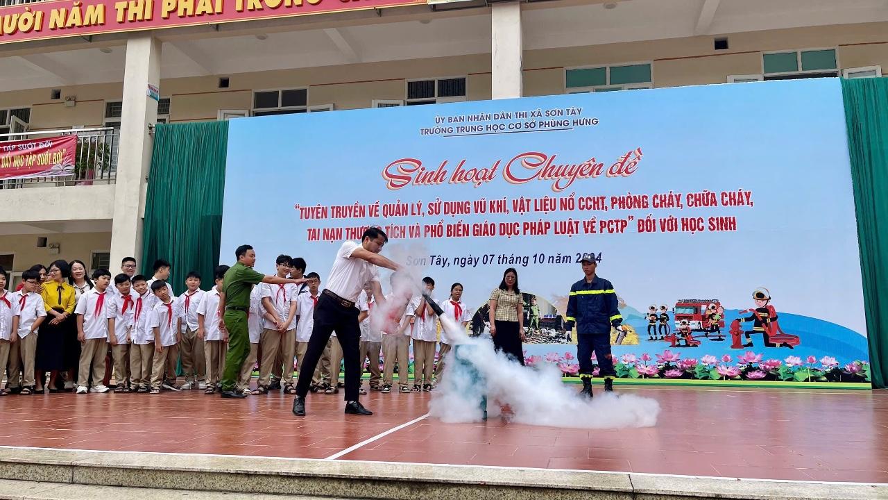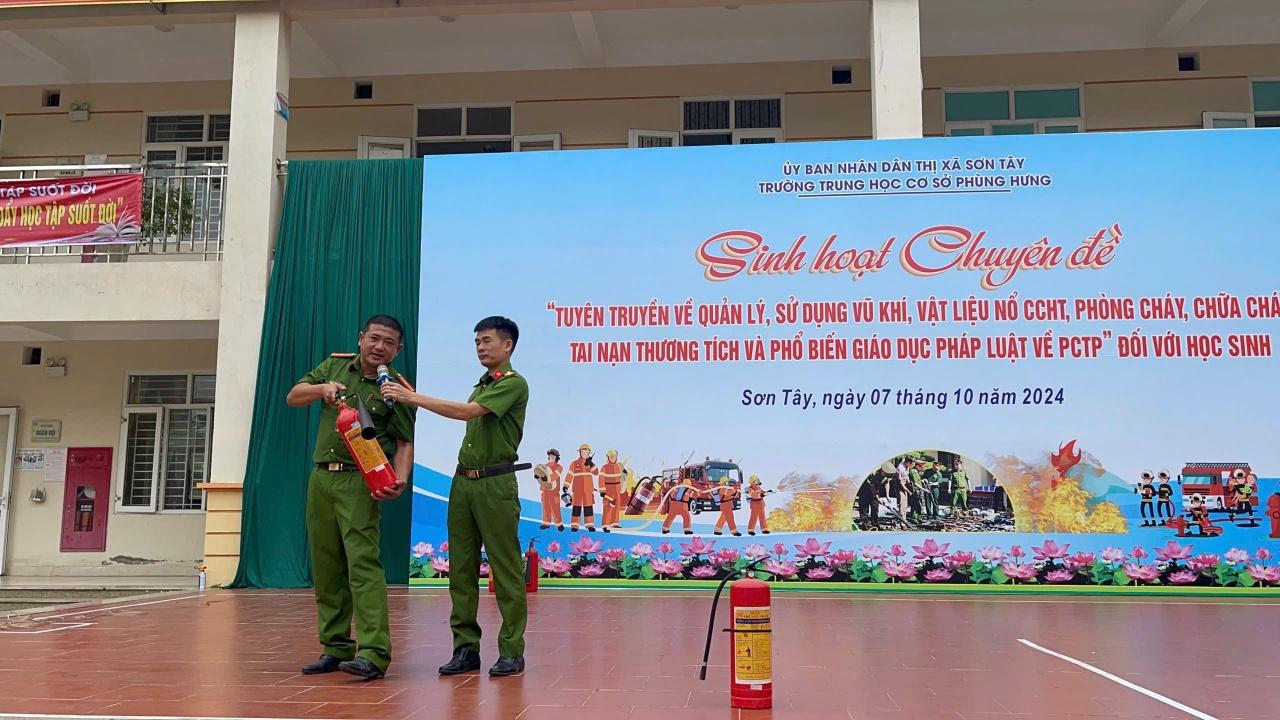 Sáng ngày 07/10, Công an phường Quang Trung phối hợp với Đội PCCC Công an thị xã Sơn Tây, Trường THCS Phùng Hưng tổ chức tuyên truyền về quản lý, sử dụng vũ khí, vật liệu nổ, CCHT, PCCC, tai nạn thương tích và phổ biến giáo dục pháp luật về PCTP đối với học sinh. Tại buổi tuyên truyền, trên 1622 học sinh của trường THCS Phùng Hưng được nghe cán bộ, chiến sỹ Đội Cảnh sát PCCC Công an thị xã Sơn Tây truyền đạt những kiến thức cơ bản về công tác phòng cháy, chữa cháy; mối nguy hiểm của cháy, nổ đối với cuộc sống con người; sự cần thiết của kiến thức phòng cháy, chữa cháy đối với mỗi công dân. Đồng thời khuyến cáo các nguy cơ cháy, nổ có thể xảy ra trong trường học, tại nhà ở, các nơi tập trung đông người; các biện pháp phòng ngừa cháy, nổ; cấu tạo, tính năng, tác dụng, cách bảo quản, sử dụng phương tiện chữa cháy; kỹ năng thoát hiểm và cứu người trong đám cháy; giải đáp những thắc mắc liên quan đến công tác PCCC, cứu nạn cứu hộ. Phổ biến các quy định của Luật Quản lý, sử dụng vũ khí, vật liệu nổ và công cụ hỗ trợ, tuyên truyền phương thức, thủ đoạn mới, hậu quả, tác hại, những nguy hiểm và công tác đấu tranh phòng, chống tội phạm, vi phạm pháp luật về vũ khí, vật liệu nổ, công cụ hỗ trợ.